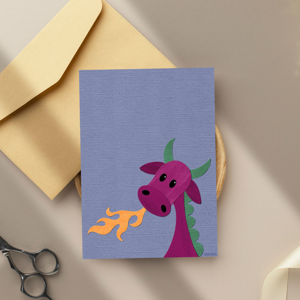 The magenta dragon is illustrated in cut paper collage style. The background is periwinkle purple.