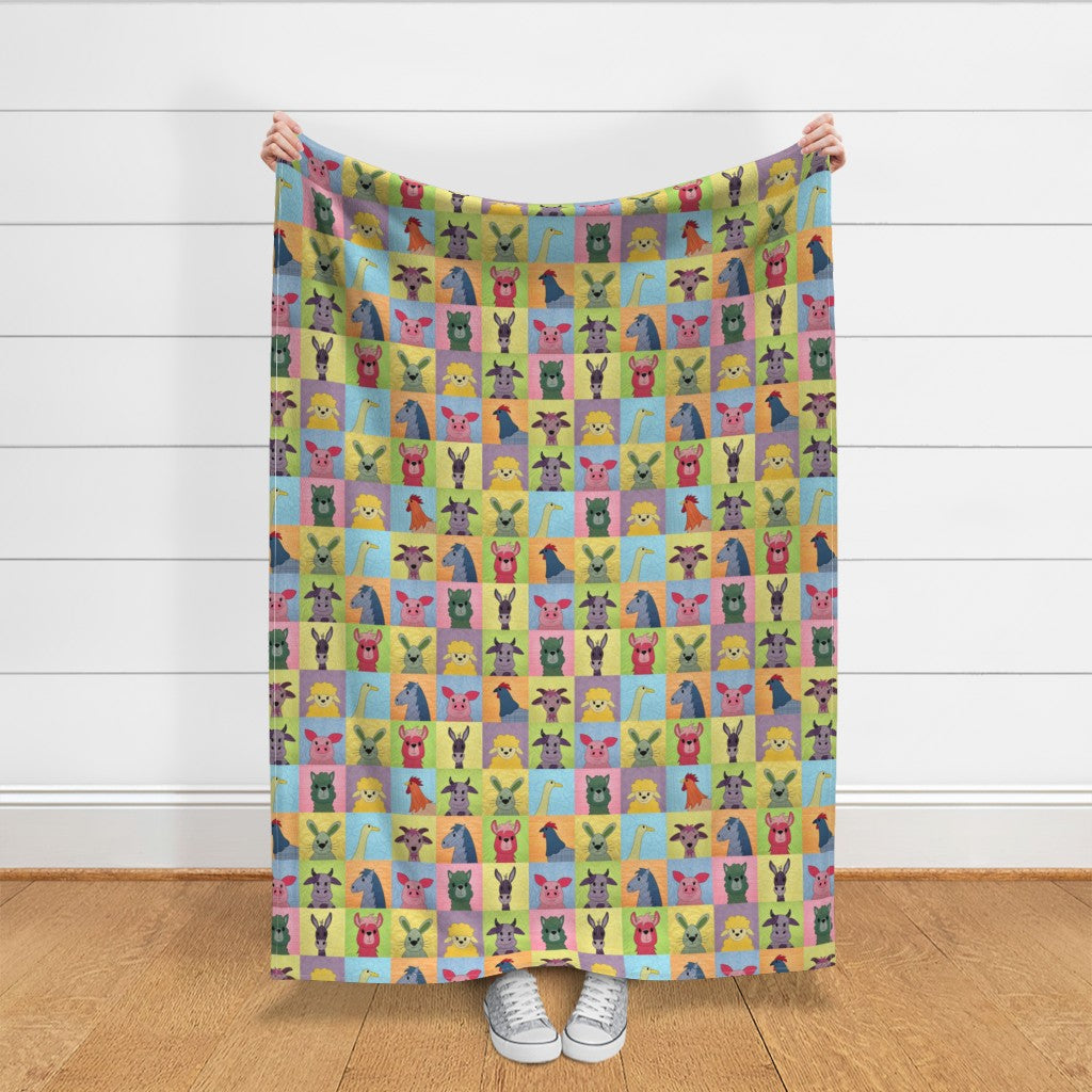 Adorable farm animal faces in easy-to-use cheater quilt fabric - perfect for children's bedrooms and throws!
