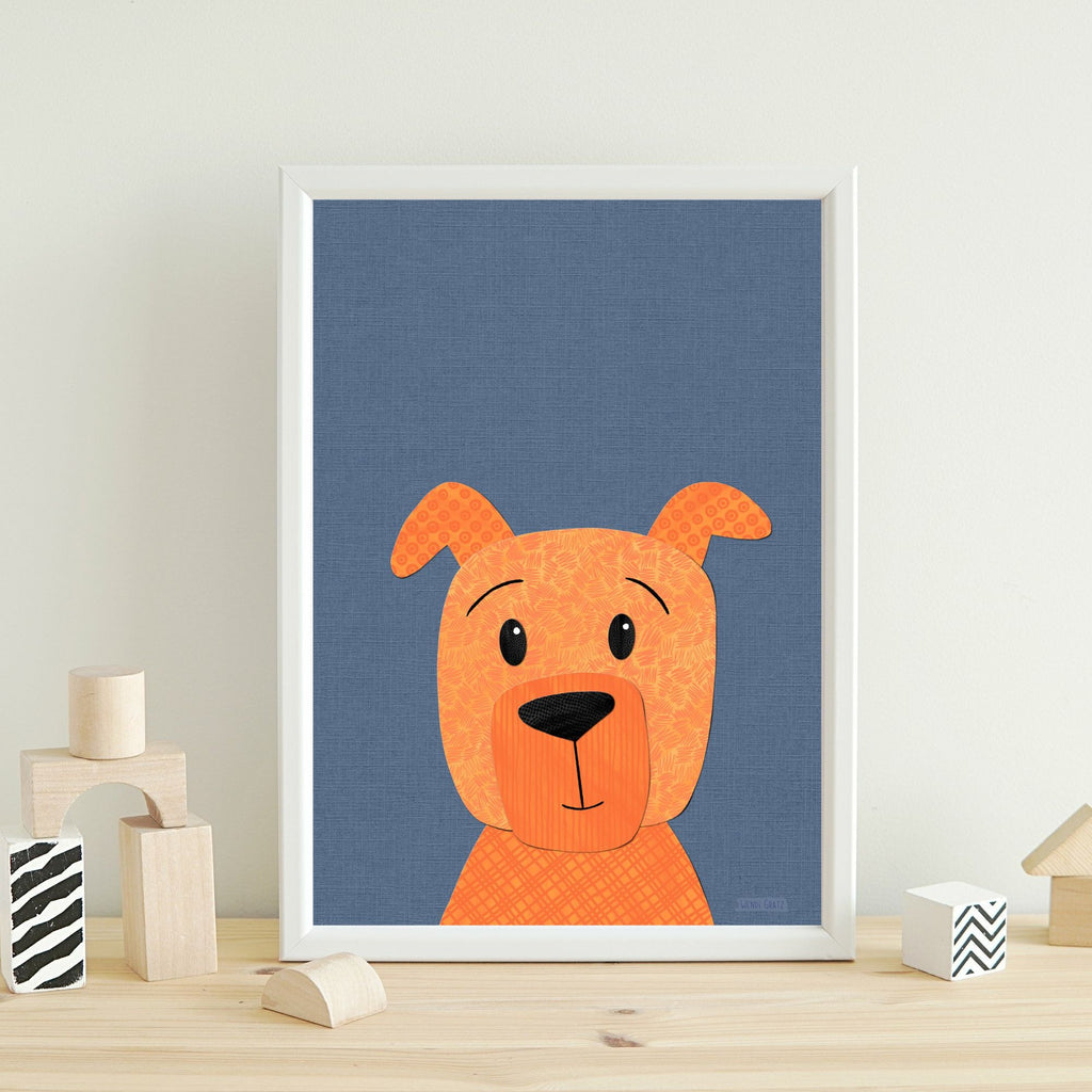 Brighten up any room in your house - or any craft project - with this cute little dog illustrated in cut paper collage style. The background is deep blue, and the dog is bright orange.